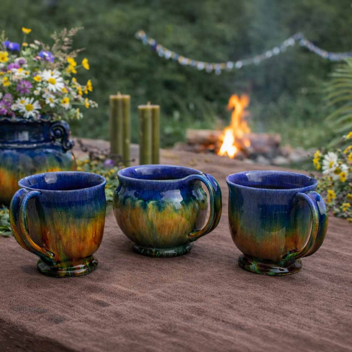 The surface is glazed, creating a glossy and expressive look where colors blend together. Each mug is handmade from natural clay.