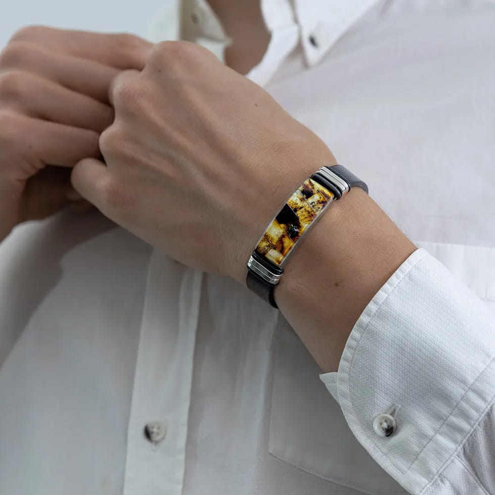 Stilīga ādas rokassprādze ar brūnu dzintaru. Baltijas jūrā iegūts dzintars sakausējums, tādejādi veidojot interesantu un unikālu krāsu mozaīku. Tā kā katrs dzintara gabals ir unikāls, varat būt droši, ka otru tādu pašu Jūs neatradīsiet. Rokassprādzei izmantotais metāls ir nerūsējošais tērauds.