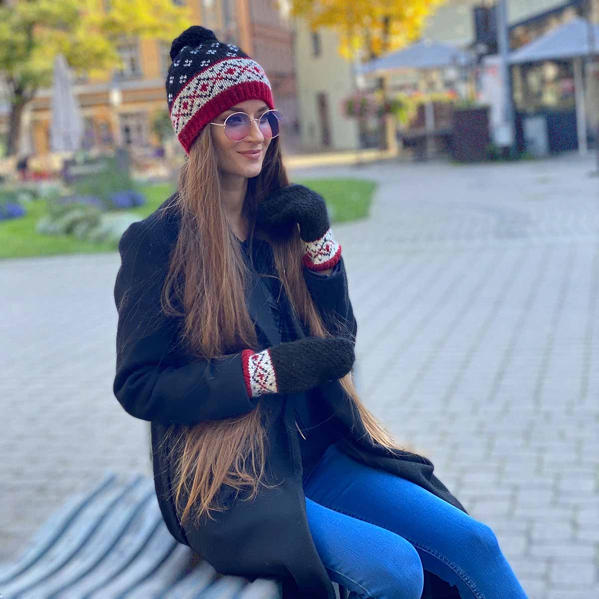 Adīta Vilnas Cepure ar Rakstu un Bumbuli, Melna