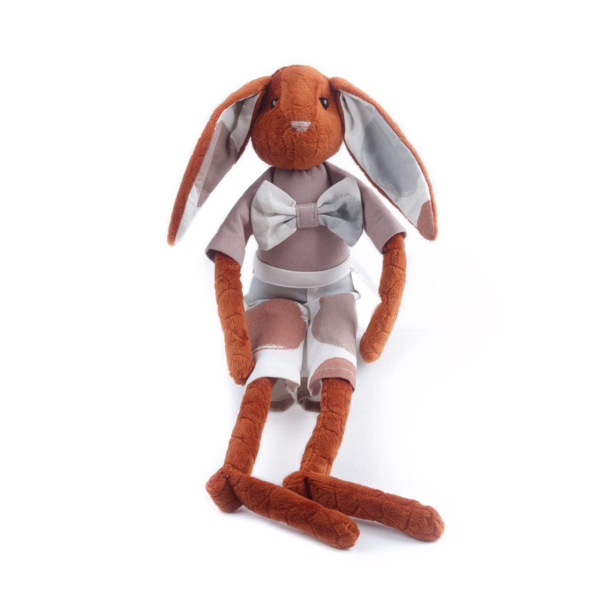 Zaķis krāsainā kostīmā – zero waste bērnu rotaļlieta. Garums stāvošā veidā: 40 cm, izstieptā: 60 cm. Mazgāt 30°C temperatūrā. Vecums: +3 gadi.