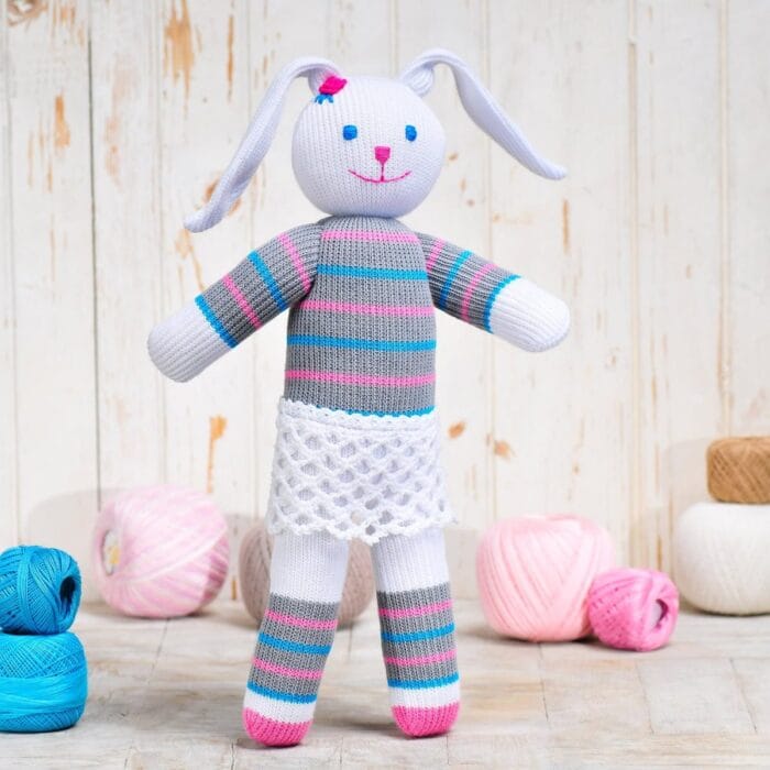 Rokām darināta bērnu rotaļlieta – balts zaķis. Droša un patīkama manta 0+ vecuma grupai. CE sertifikāts, dabīgi materiāli. 100% kokvilna un polieistera pildījums.