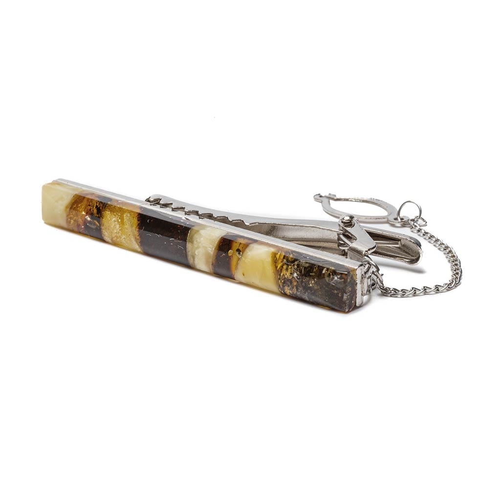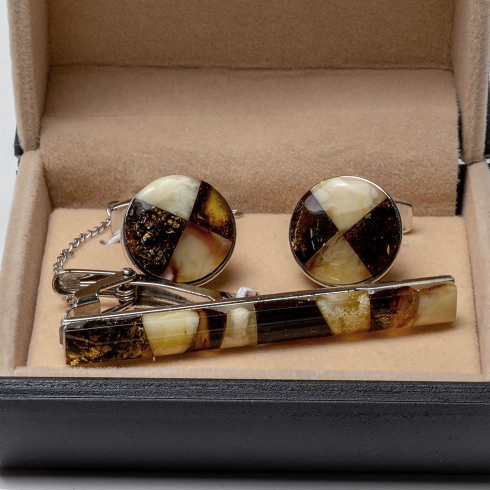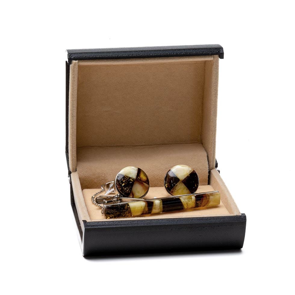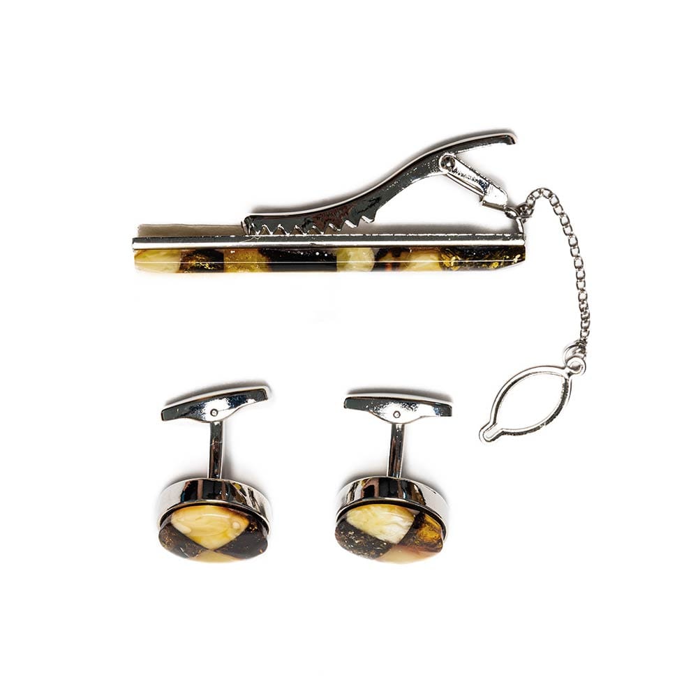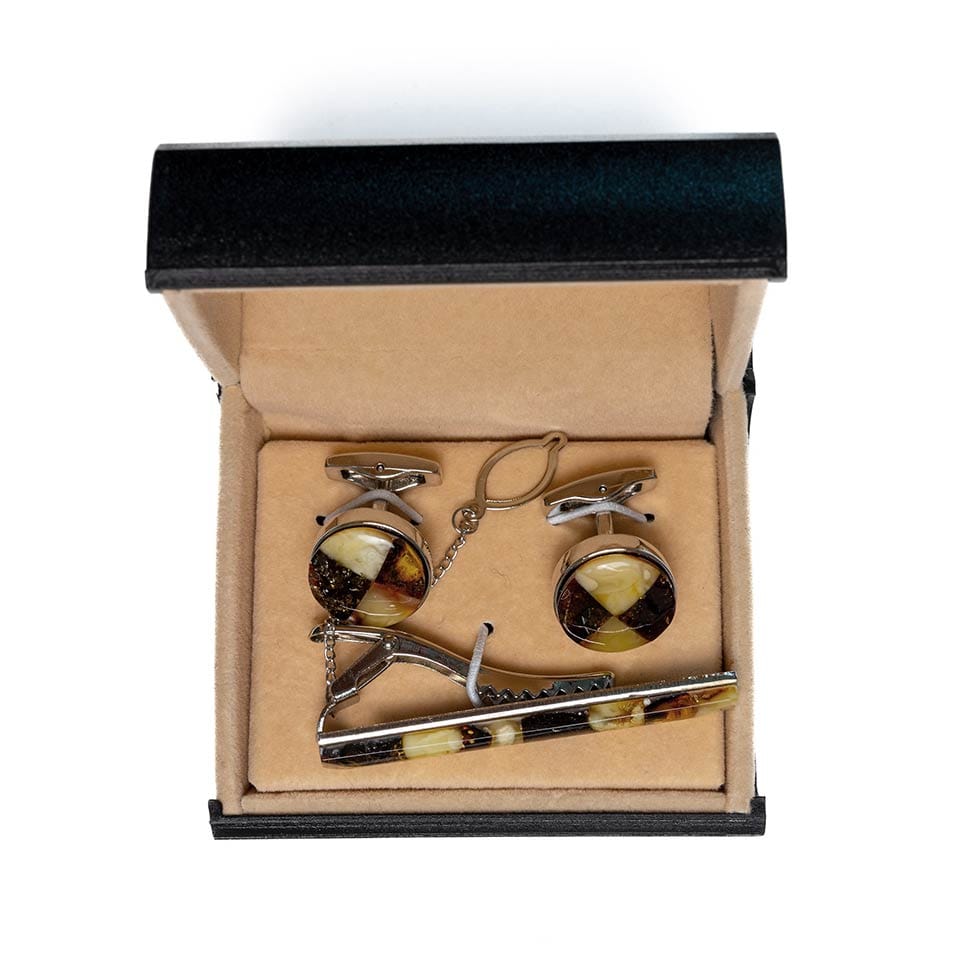 Dzintara aksesuāru komplekts vīriešiem. Komplektā ietilpst dzintara aproču pogas un kaklasaites turētājs sudraba krāsā, kas ievietoti glītā kastītē.