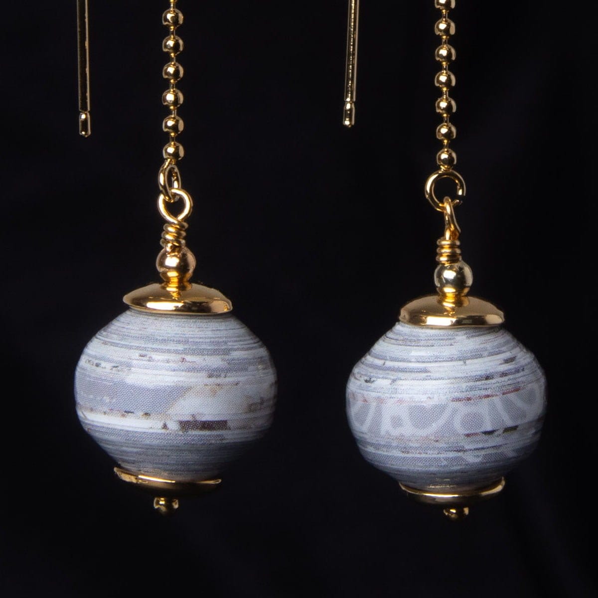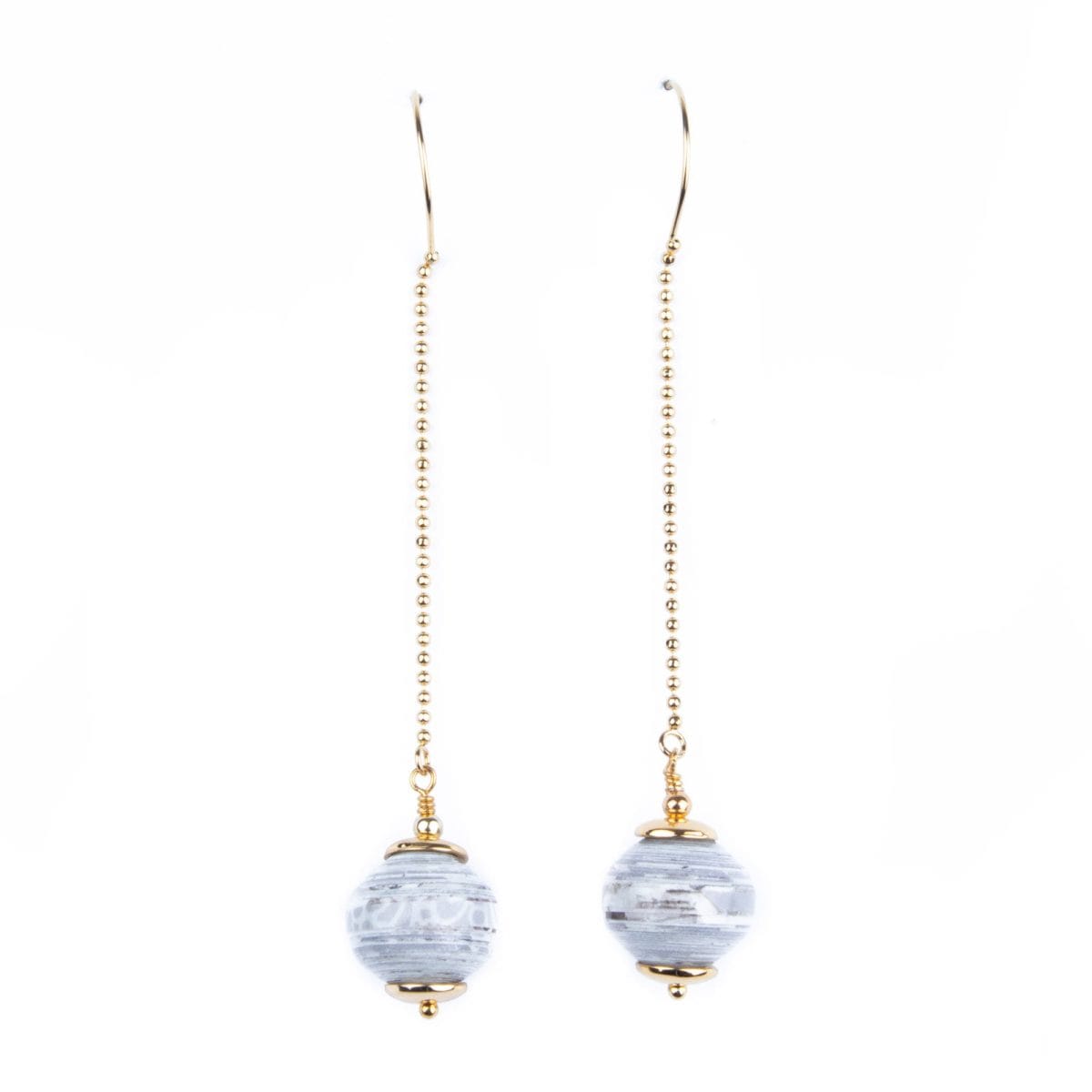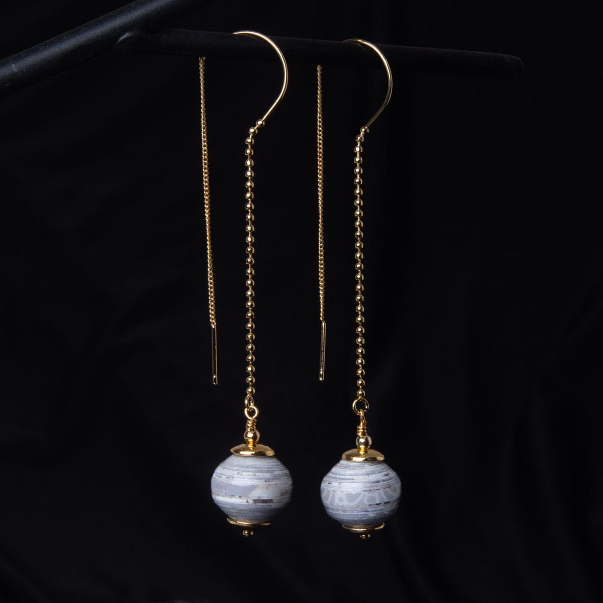 Gari papīra auskari ķēdītē. Garums ~9.5 cm. Auskaru āķi un pārējās detaļas – apzeltīts misiņš ar 18 karātu zelta pārklājumu.