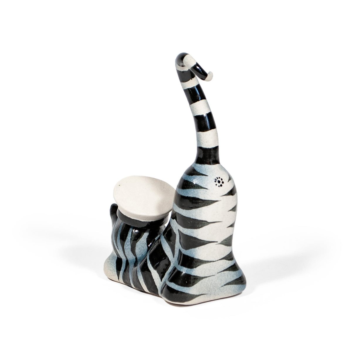 Keramikas figūra – kaķis ar cepuri. 100% roku darbs. Daļa no lielās kaķu kolekcijas saimes. Oriģināla dizaina un acīm baudāma figūra mājokļa interjeram.