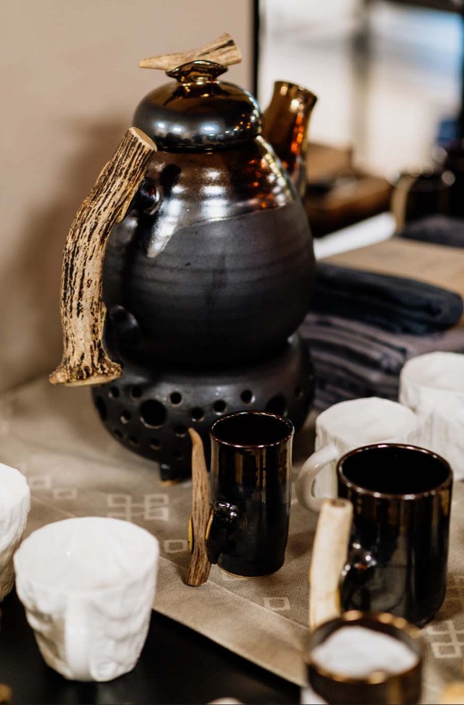 Keramikas Tējkanna uz Pamatnes ar Raga Rokturi, Zaļbrūna