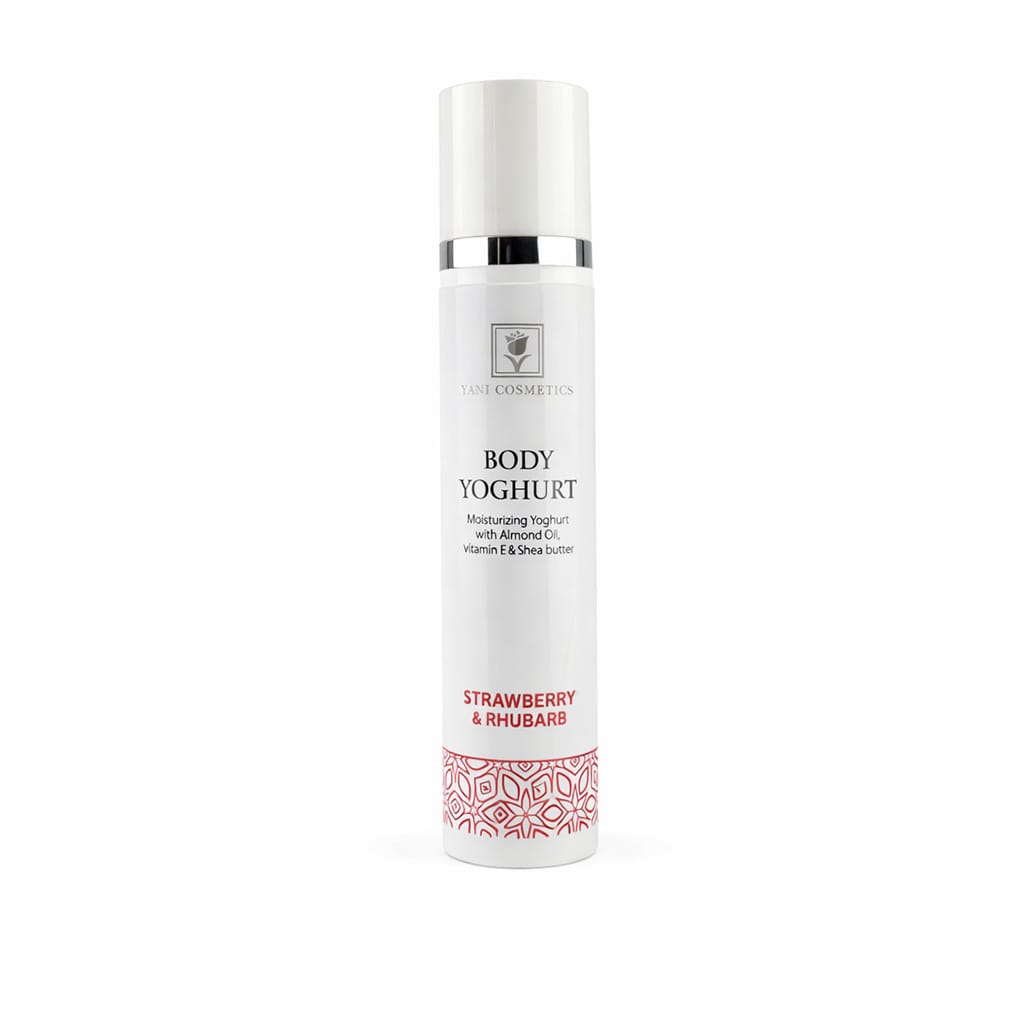 Maigas un vieglas tekstūras ķermeņa jogurts “Zemene un Rabarbers” ar auzu ekstraktu, mandeļu eļļu un šī sviestu.