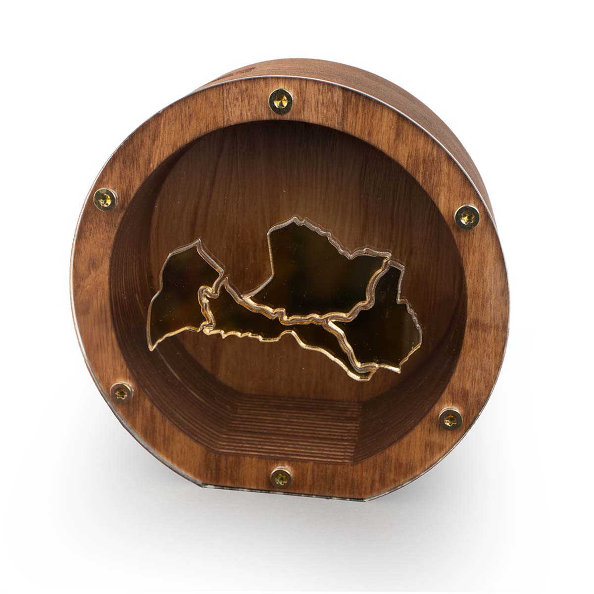 Koka krājkase ar Latvijas kontūru ir radīta cilvēkiem, kuri novērtē dizainu, simboliku un kvalitatīvus materiālus. Krājkase izgatavota no izturīga koka plātņu materiāla, veidota apaļā formā un papildināta ar caurspīdīgu akrila priekšpusi, kas ļauj redzēt sakrāto naudu un padara visas monētas par daļu no dizaina. Latvijas kontūras siluets vidū ir izgriezts no zelta krāsas spīdīga akrila, kas laistās ja uz tā uzkrīt kaut nedaudz gaismas.