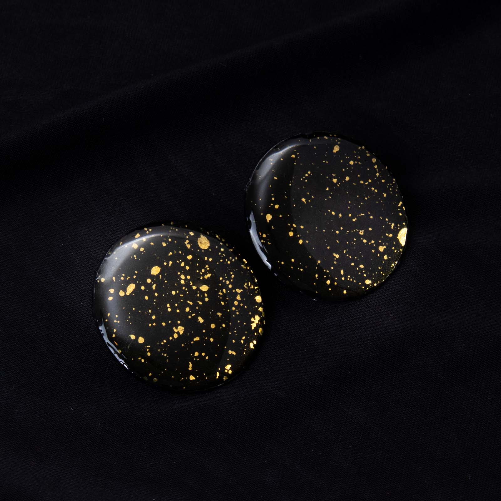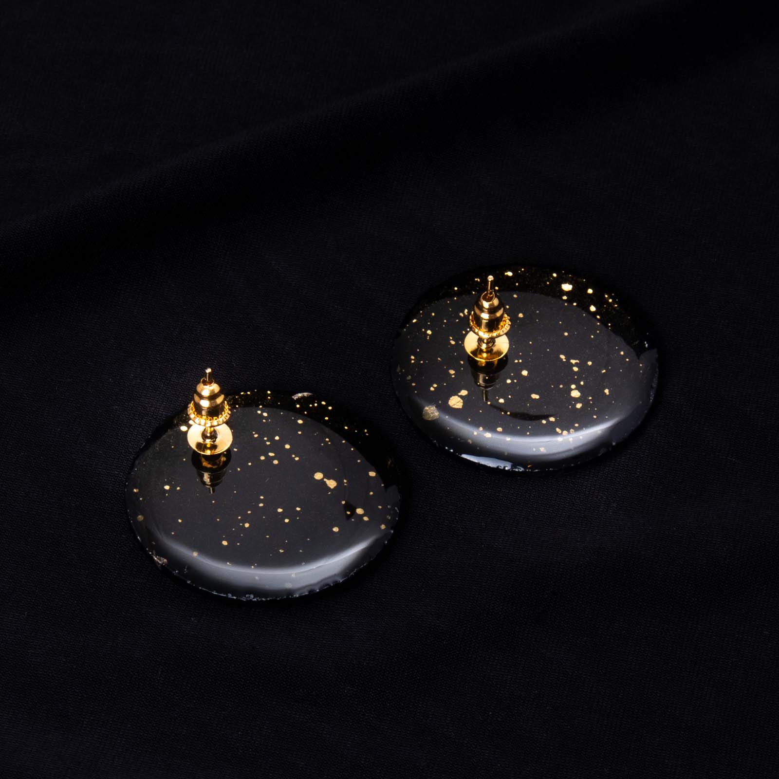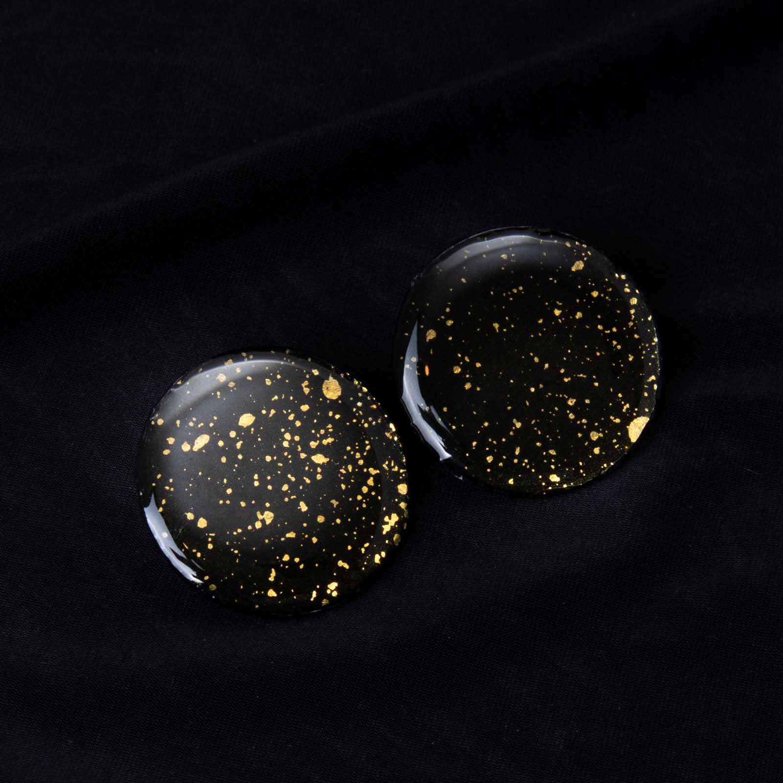 Papīra podziņauskari. Diametrs – 3 cm. Auskaru kājiņas – apzeltīts misiņš ar 18 karātu zelta pārklājumu. Pārklāti ar 2 komponentu epoksīdu.