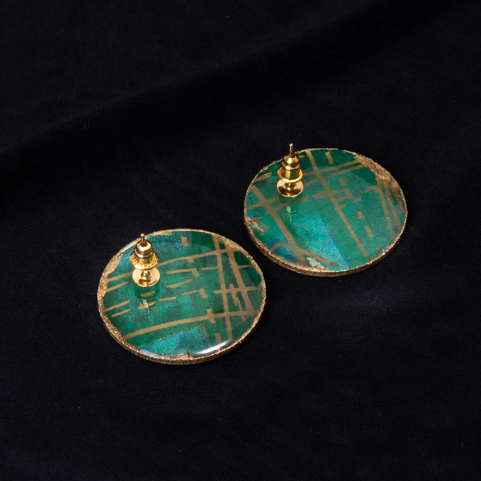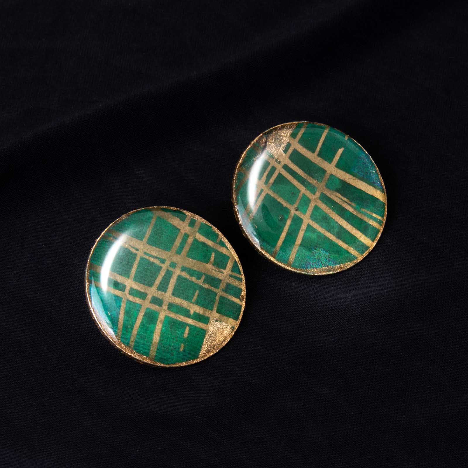 Papīra podziņauskari. Diametrs – 3 cm. Auskaru kājiņas – apzeltīts misiņš ar 18 karātu zelta pārklājumu. Pārklāti ar 2 komponentu epoksīdu.