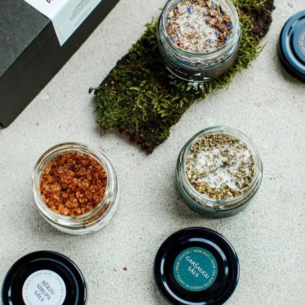 Latvijas garšas sāls ( 95g ) – jūras sāls, ķimenes, kaltētas dilles, ķiploku pulveris, kliņģerīšu ziedi.
