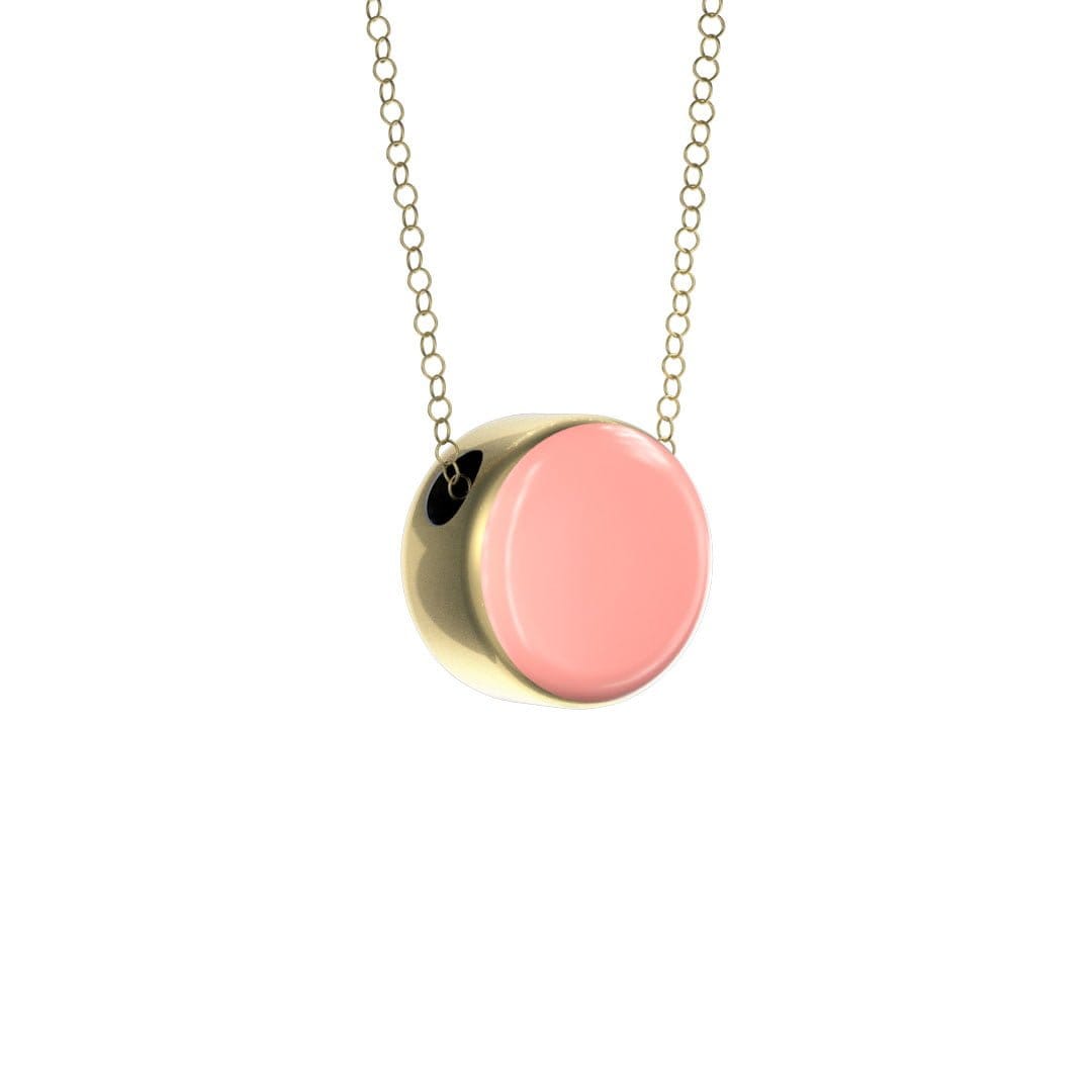 Rozā porcelāna kaklarota. Kulons apgleznots ar 24k zeltu. Ķēdīte: 14k apzeltījums. Ķēdītes izmērs – 420 mm, kulons – 10 mm. Svars: 2 g.