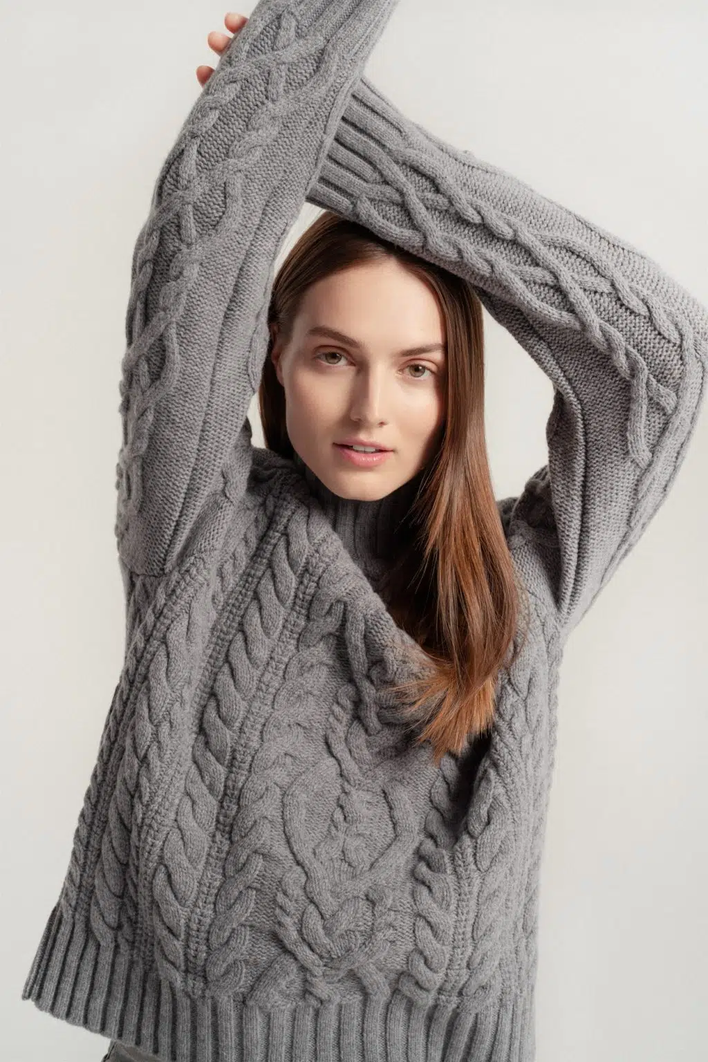 Ar brīvu siluetu, biezām pīnēm un siltu augsto apkakli — ideāla izvēle vēsākām dienām.