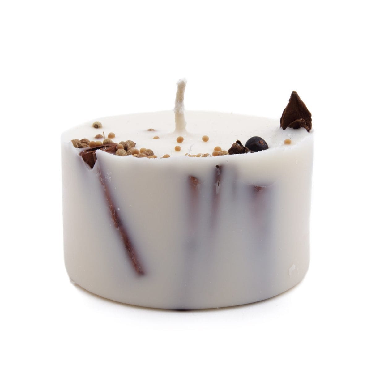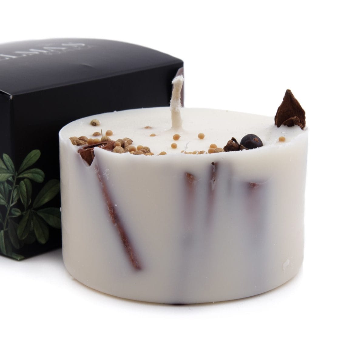 Sojas vaska svece ar Ziemassvētku garšvielām un aromātu – degšanas ilgums: 20 stundas; augstums: ~4 cm; diametrs: 8 cm.