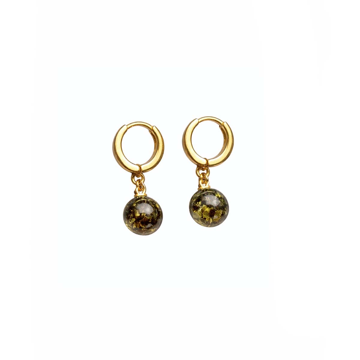 Apzeltīti 925 proves sudraba riņķveida auskari ar brūnzaļu Baltijas dzintara akmeni.