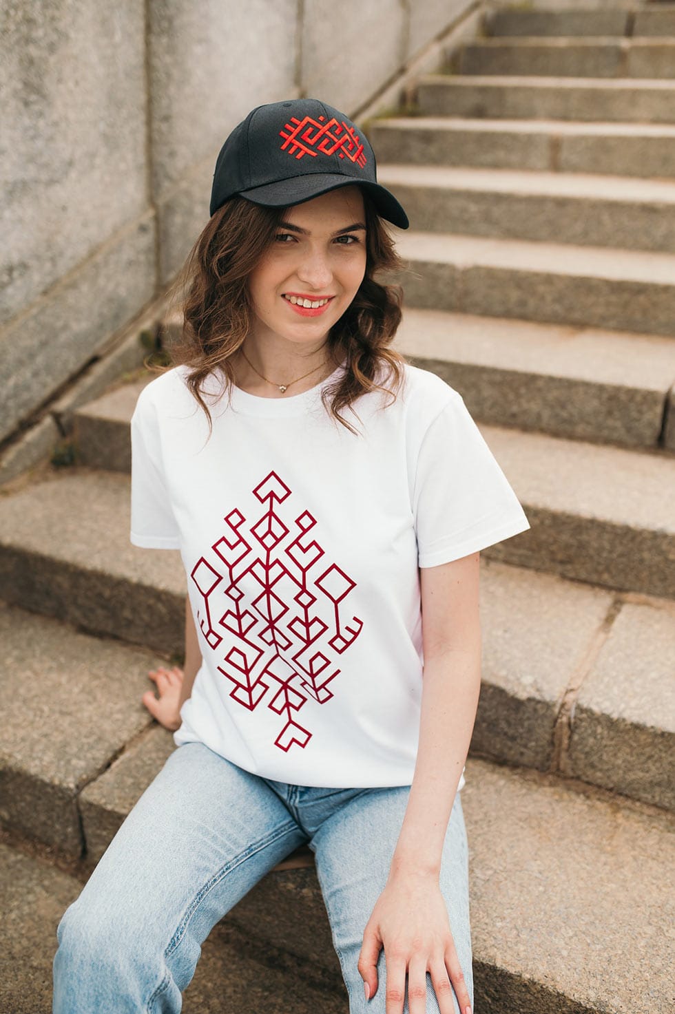 Krāsa: balta ar tumši sarkanu dizainu