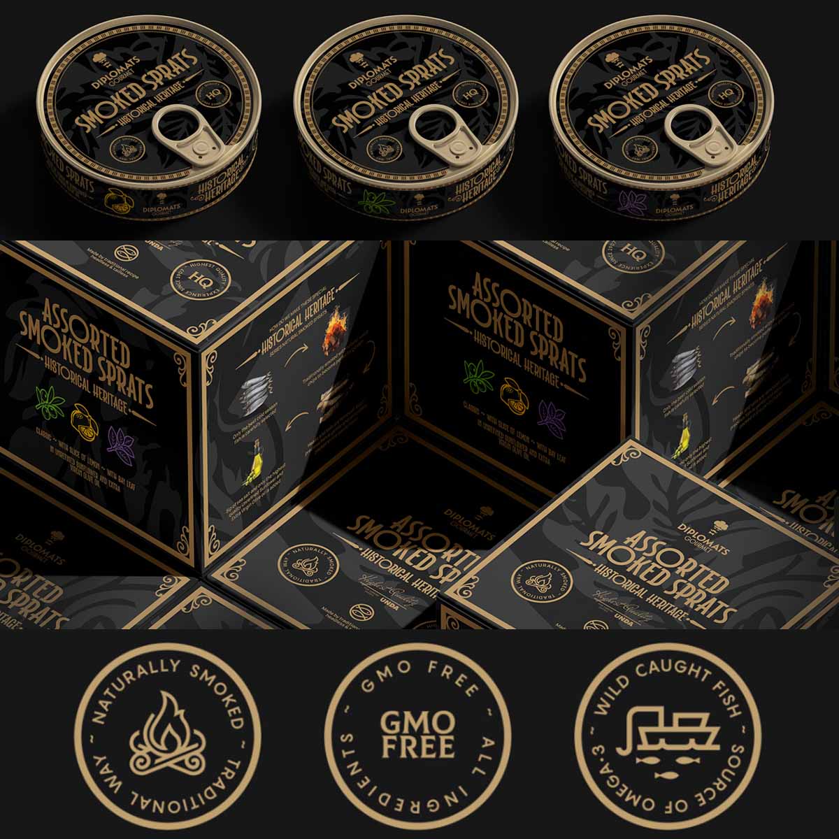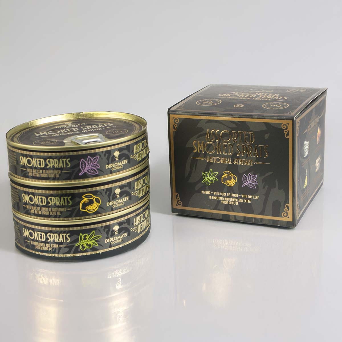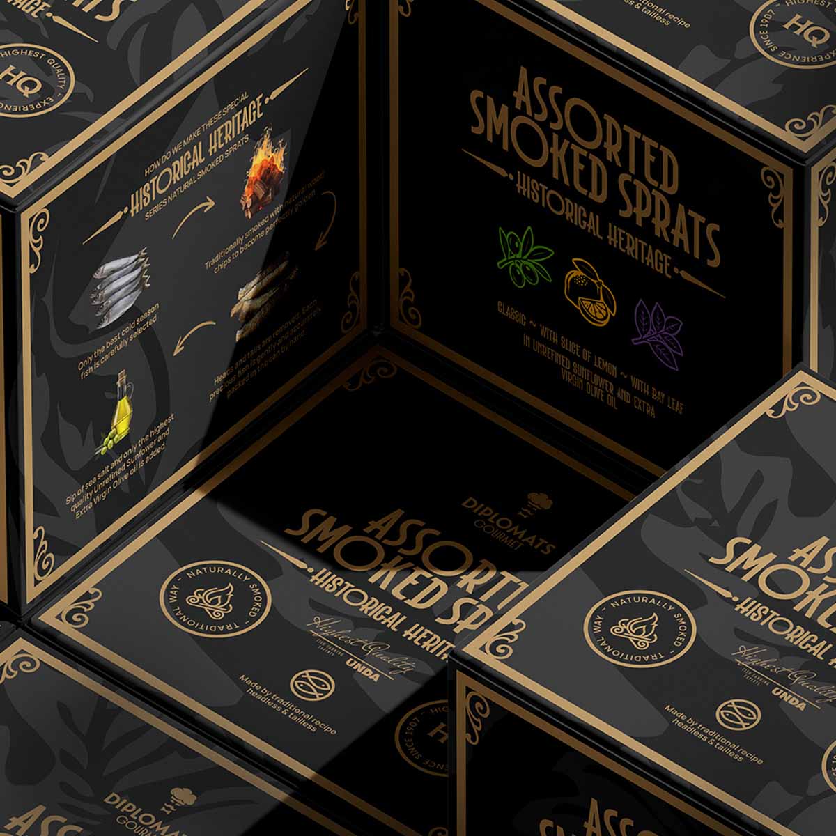 Diplomāts Gourmet smoked sprat selection. Historical flavour—time-tested quality.