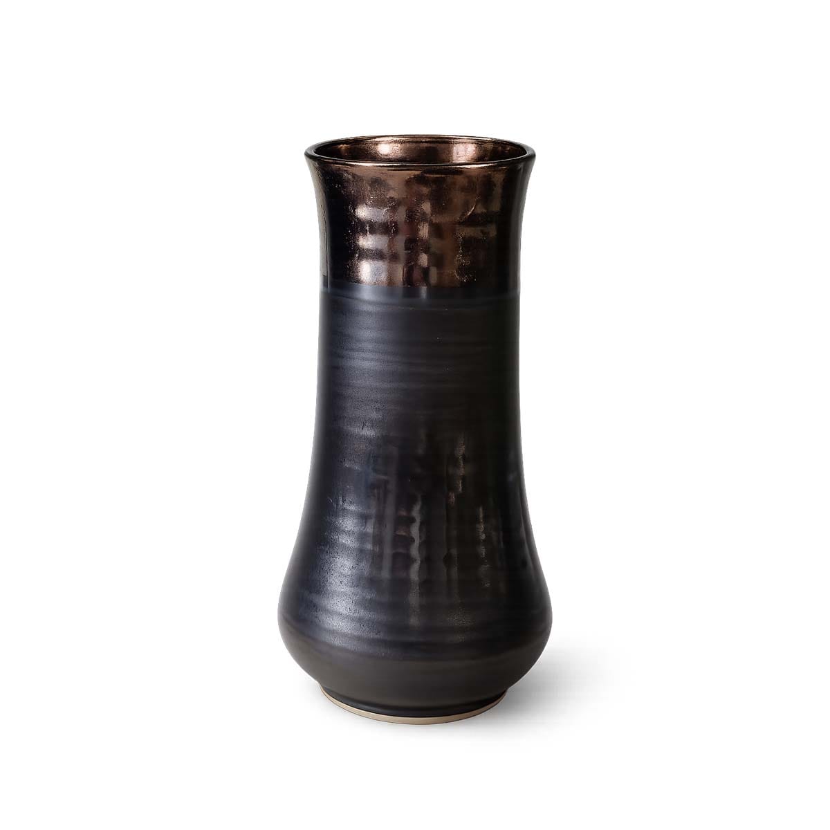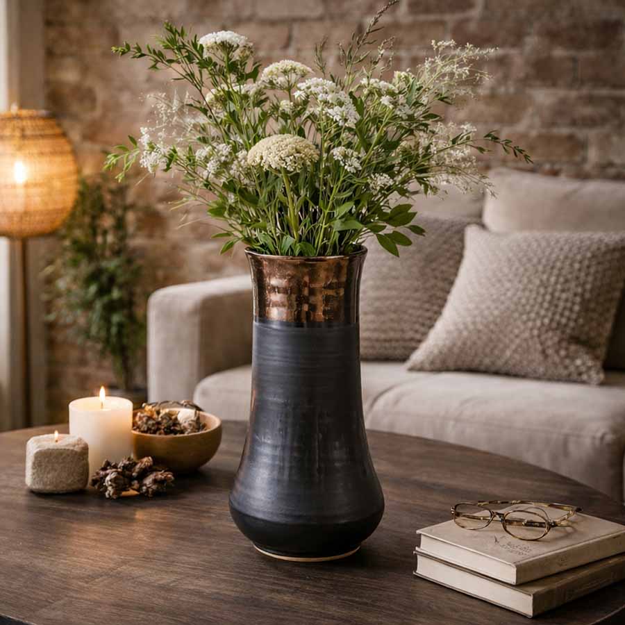 When human hands meet clay, something more than an object is created — a piece of art. This ceramic vase is carefully handcrafted, carrying its own unique character. Its deep dark tone and subtle bronze rim beautifully highlight flowers and enrich the atmosphere of any interior.