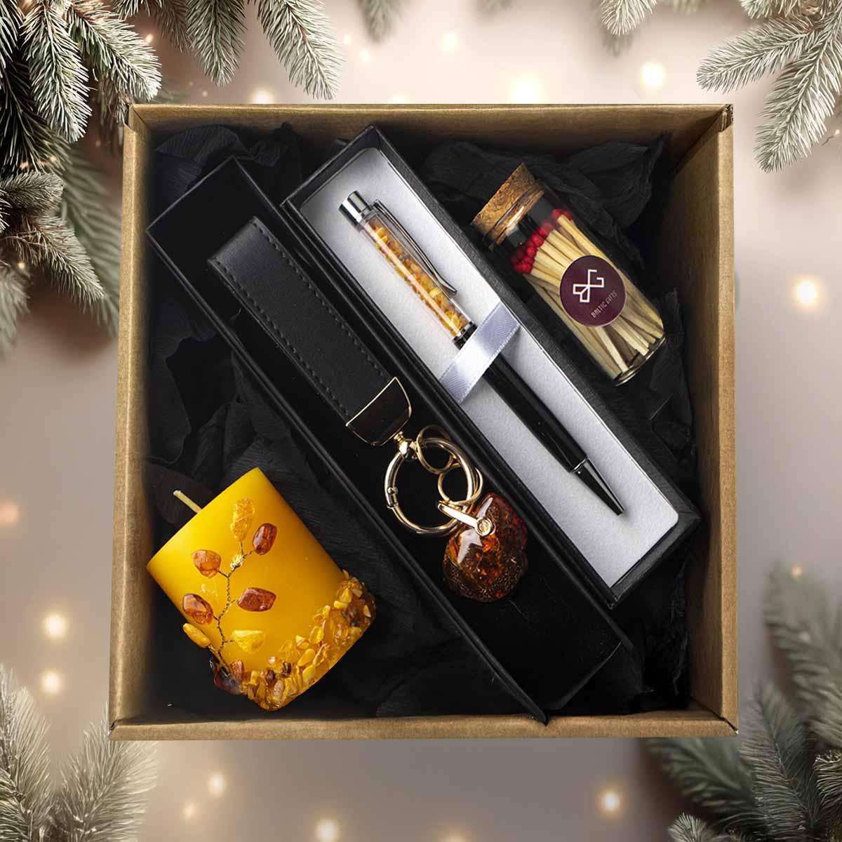 This elegant gift set brings together carefully selected accessories, each crafted to add warmth, style, and a touch of Baltic charm. Inside the box, you will find an amber-leaf candle that creates a cozy atmosphere, a pen accented with natural amber, a premium leather keychain with amber details (available in brown or yellow) , and a stylish glass jar filled with matches.