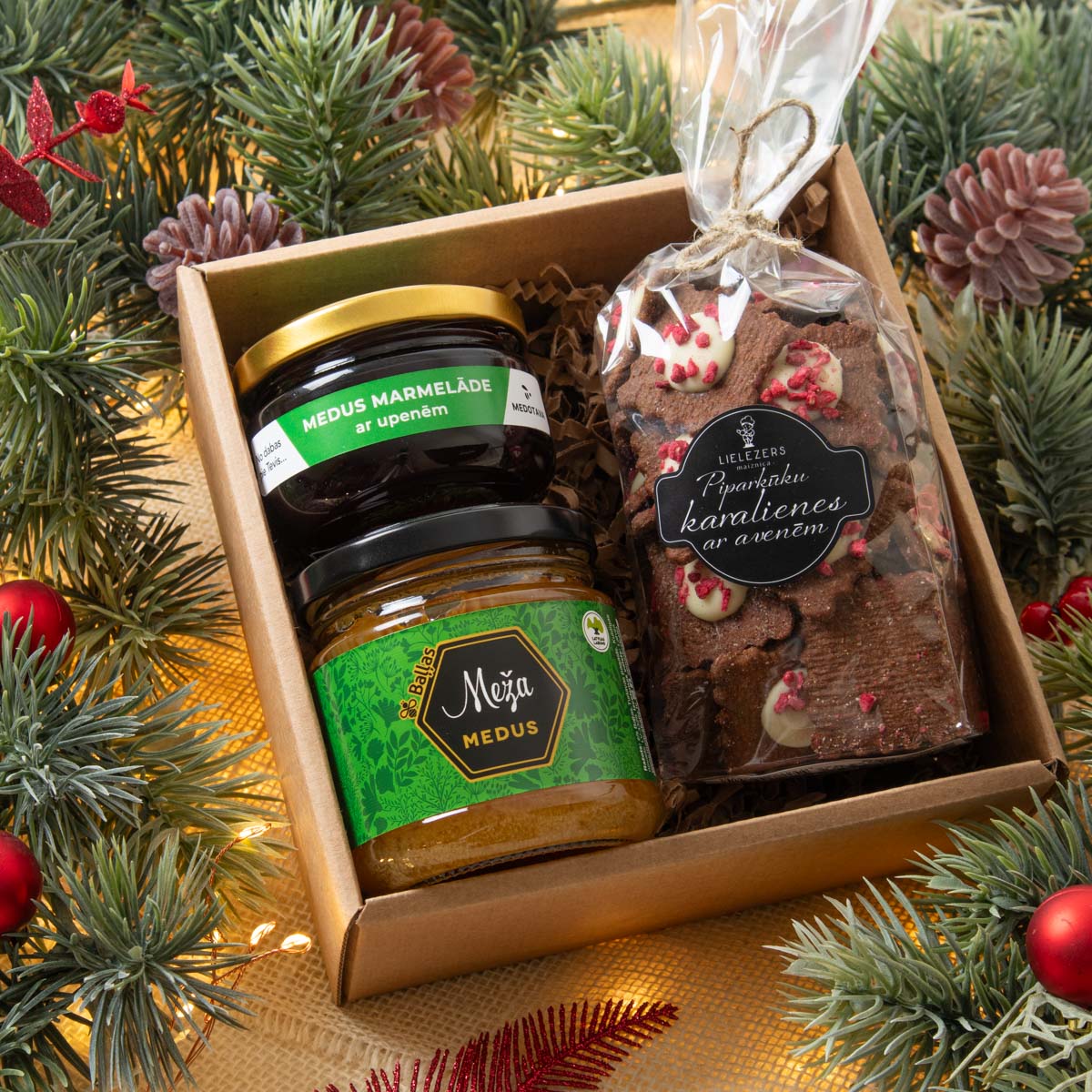 The set includes delicious rye gingerbread with white chocolate and dried raspberries (I’ll tell you a secret – gift receiver won’t be able to stop eating them), forest flower honey, which will go well with tea or as a snack on rye bread, as well as honey marmalade with blackcurrant, that will be a perfect snack for everyone!