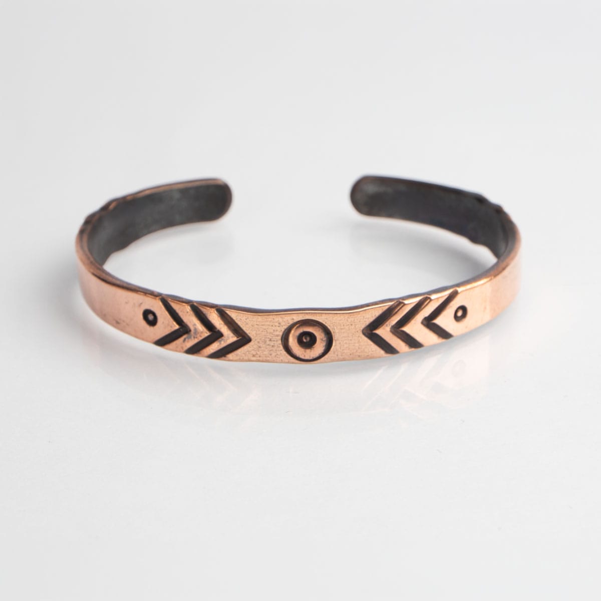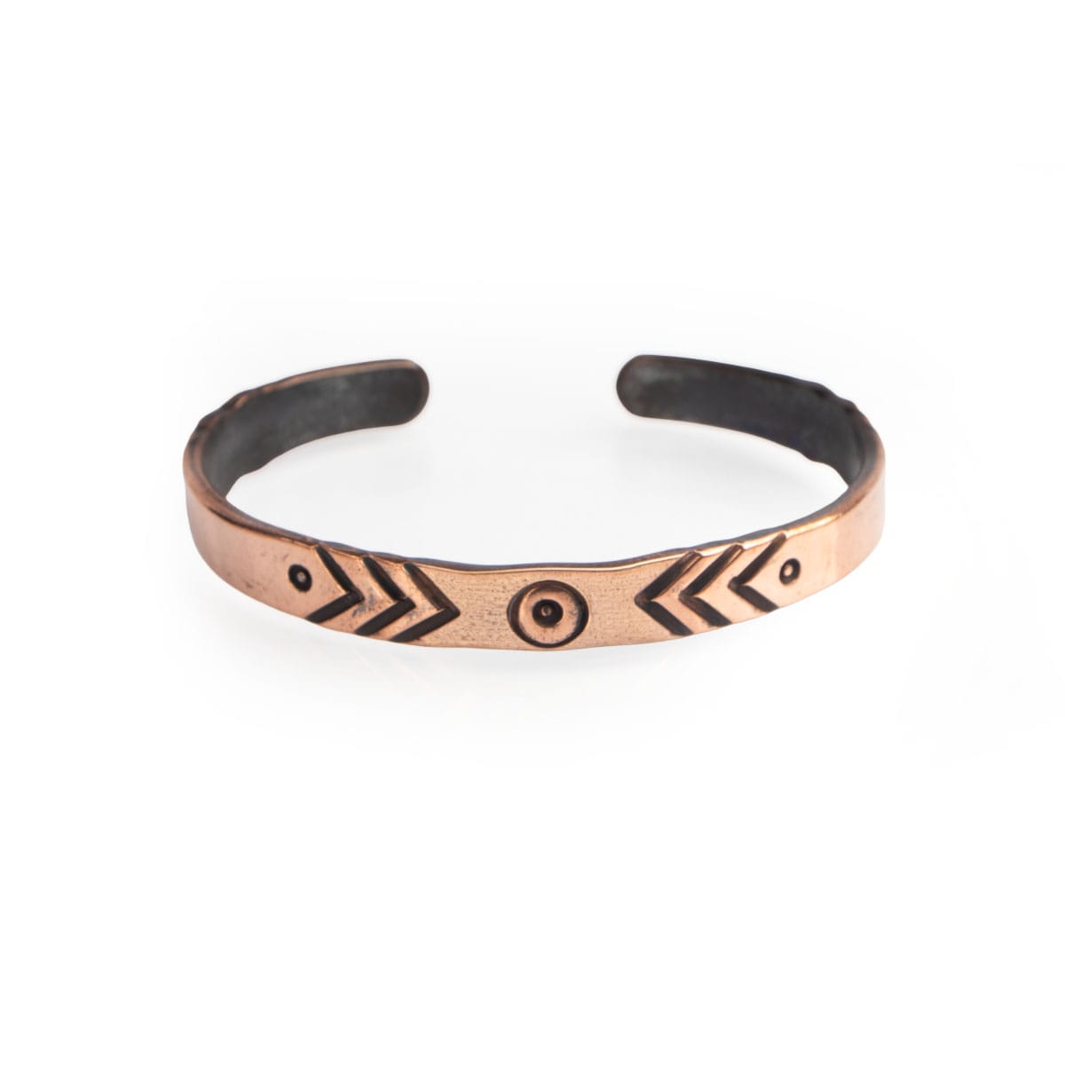 Handmade copper bracelet with ethnographic symbols. Bracelet length: 16 cm, width: ~10 mm, size: adjustable by gently squeezing or pulling it.