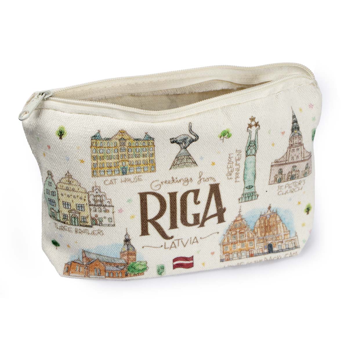 The cosmetic bag features the most iconic landmarks of Old Riga in a charming watercolor illustration that works as a visual guide to Latvia’s capital:
