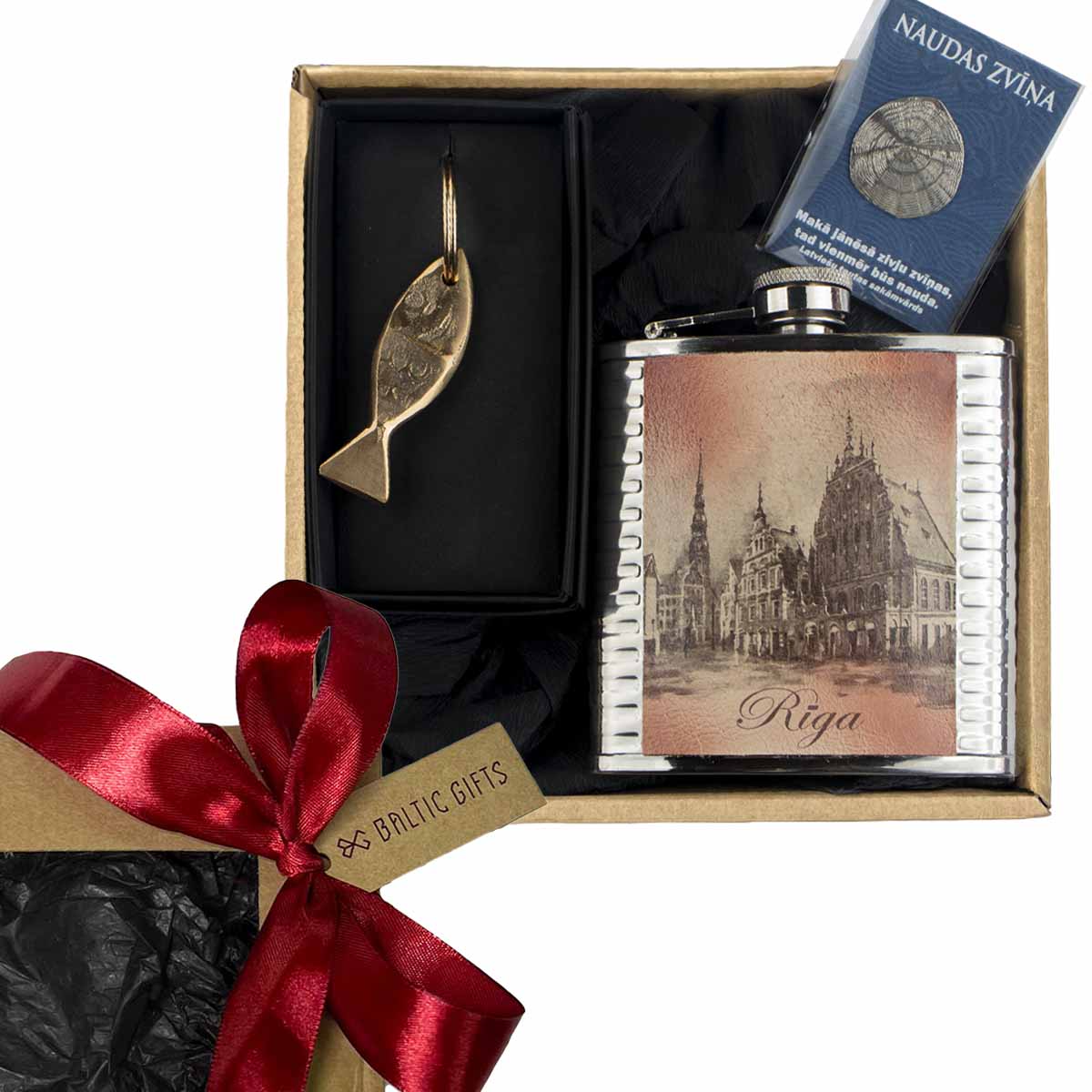 This gift set is an excellent choice for those who love fishing and appreciate Latvian symbolism. It combines three traditional talismans of luck and strength — a metal hip flask with leather detailing, a money scale charm believed in Latvian folklore to bring prosperity and wealth, and a keychain made of bronze or black oak, symbolizing strength and good fortune.
