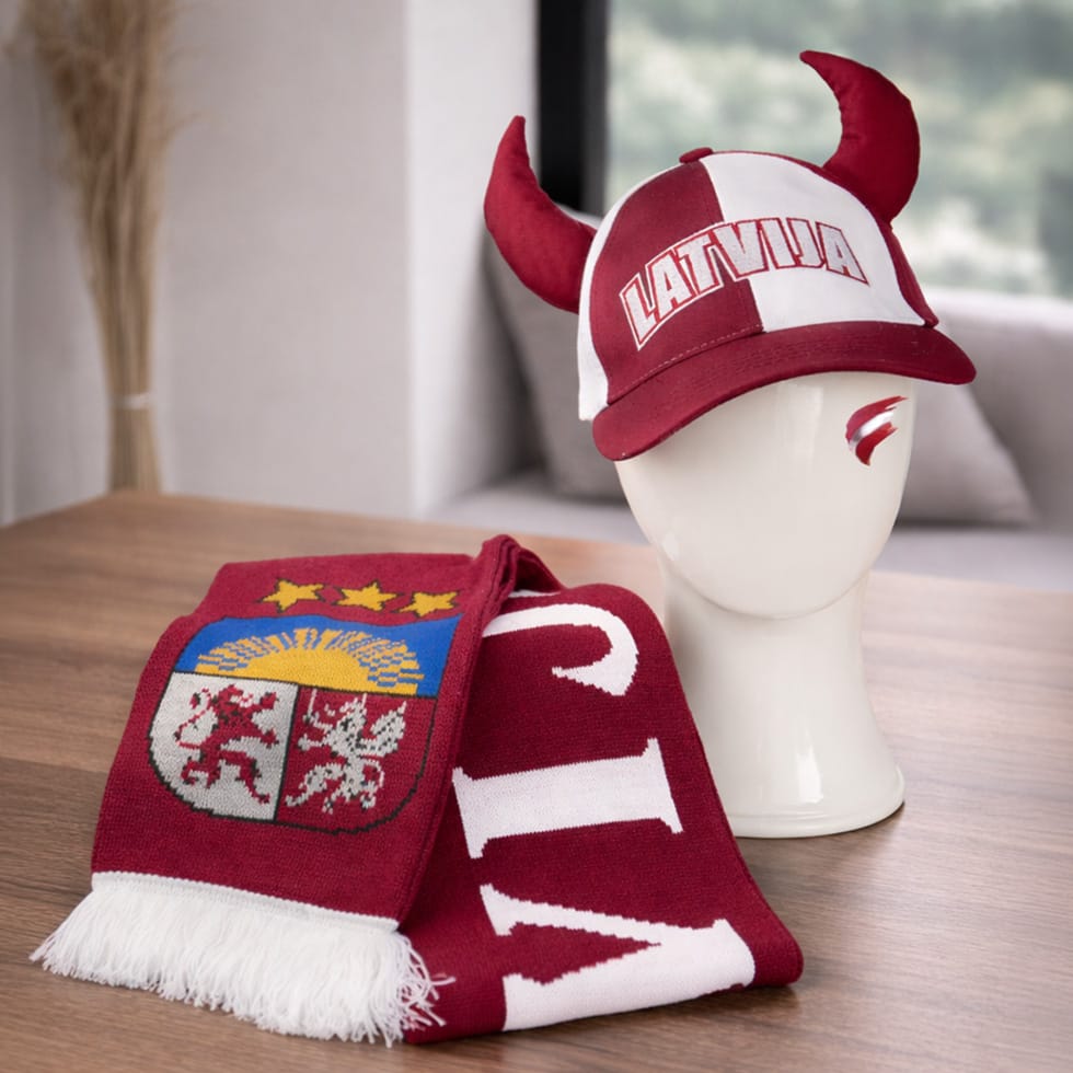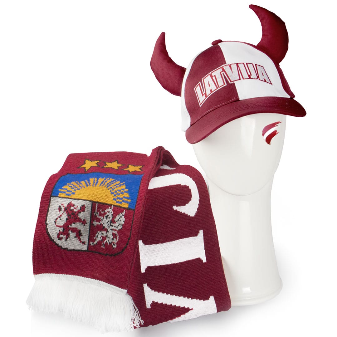 The Latvian hockey fan set consists of a burgundy scarf with the Latvian coat of arms and a horned cap with the inscription LATVIJA.
