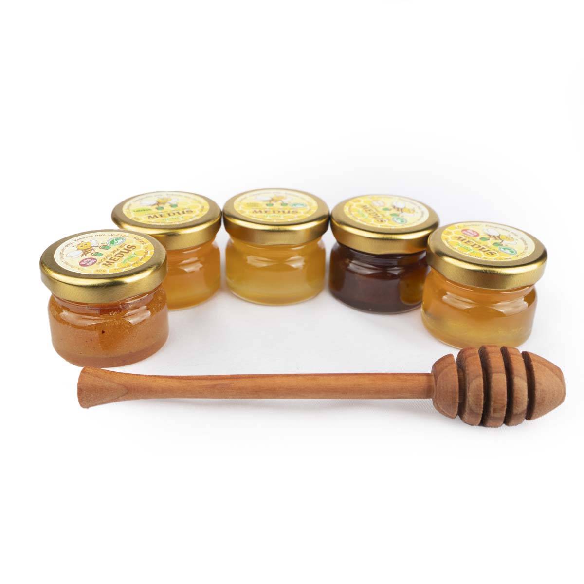 It includes jars of heather honey, buckwheat honey, hogweed honey, wild raspberry forest honey, & linden blossom honey. Each jar contains 30 g of honey. This is a delicious and healthy gift that will delight everyone!