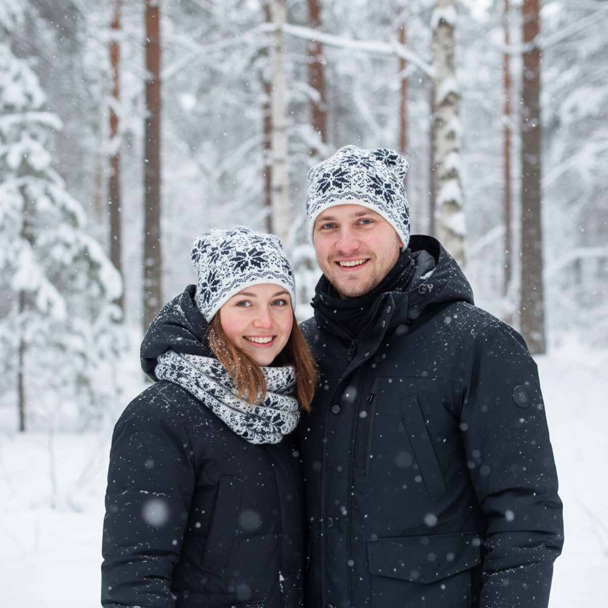 Knitted hat in white color. Complemented by a blue Morning Star signs. Composition of wool and acrylic. Great accessory for the holidays.