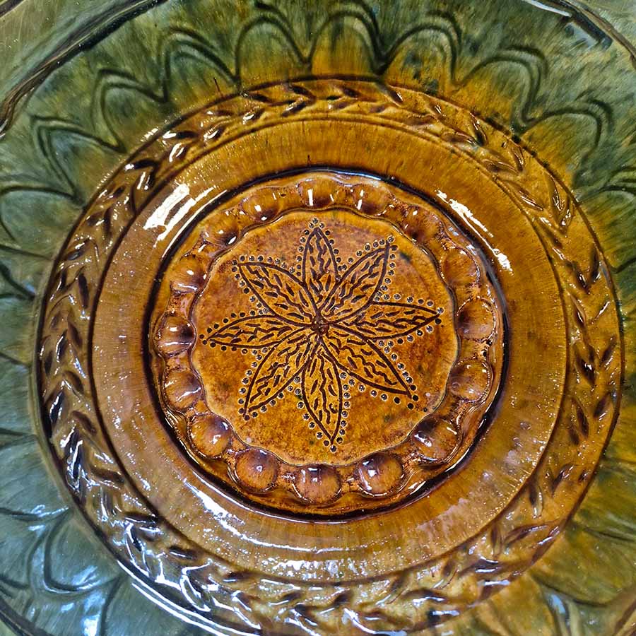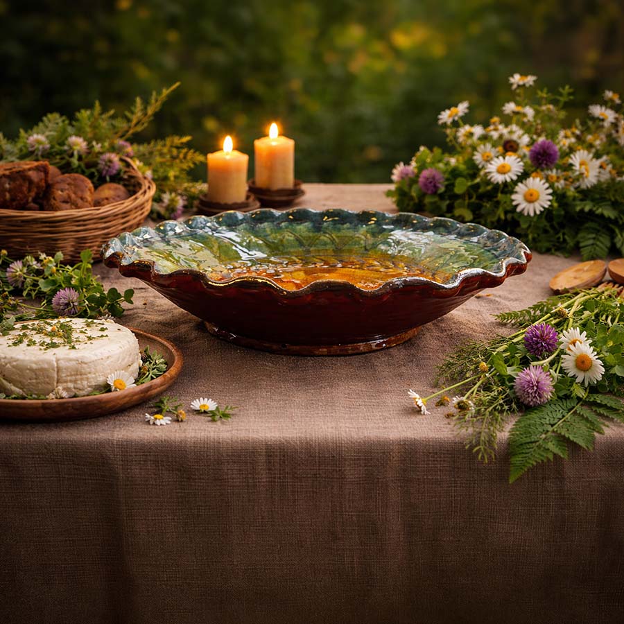 This clay plate is a product of Latgale ceramics, made using traditional pottery techniques. It features characteristic glaze transitions and warm, nature-inspired color.