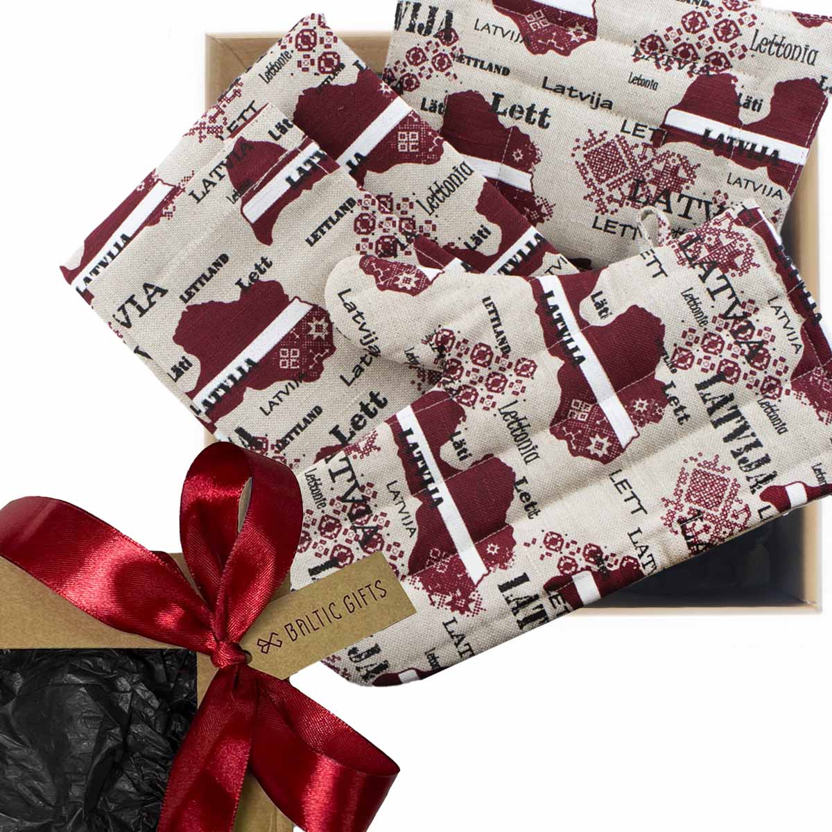 Each item is decorated with Latvian symbols – the map of Latvia, the national flag, and traditional folk patterns in red and white. This gives the set a unique national character and makes it a wonderful gift for family, friends, or colleagues both in Latvia and abroad.