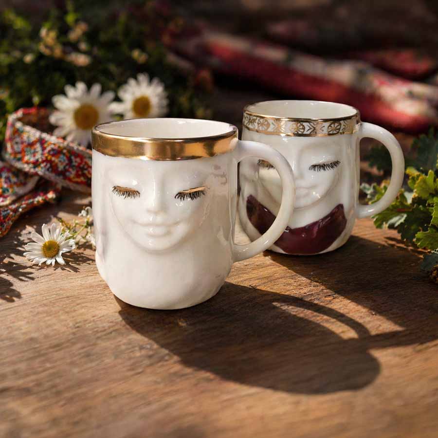 A porcelain mug from the Ozoliņš Pottery studio, inspired by Latvian culture and traditional folk imagery. The design features a female folk face with closed eyes, symbolizing inner harmony, femininity, and a deep connection to heritage.