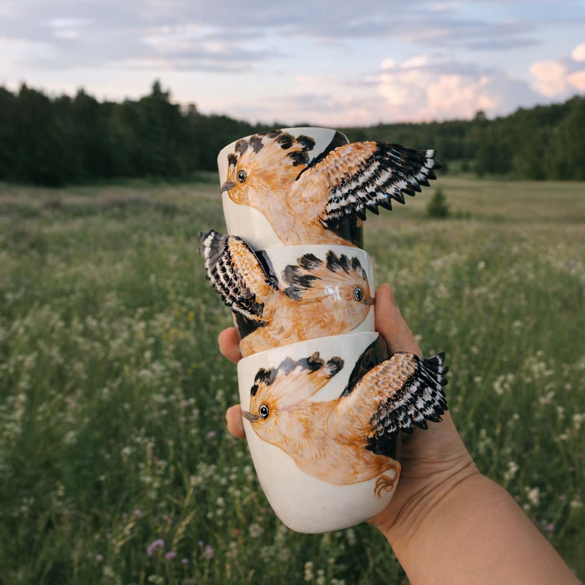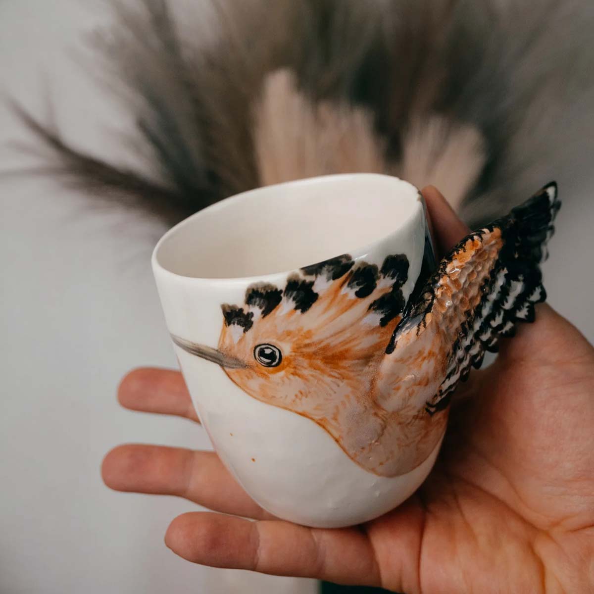 A unique porcelain cup from the Ozoliņš Pottery studio, inspired by the nature of Latvia. The cup is decorated with an artistically crafted wing and a flying hoopoe motif, giving the piece a sense of movement and liveliness.