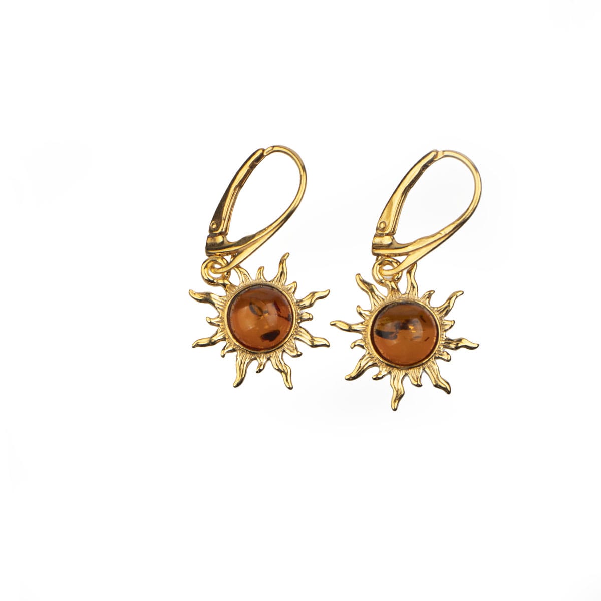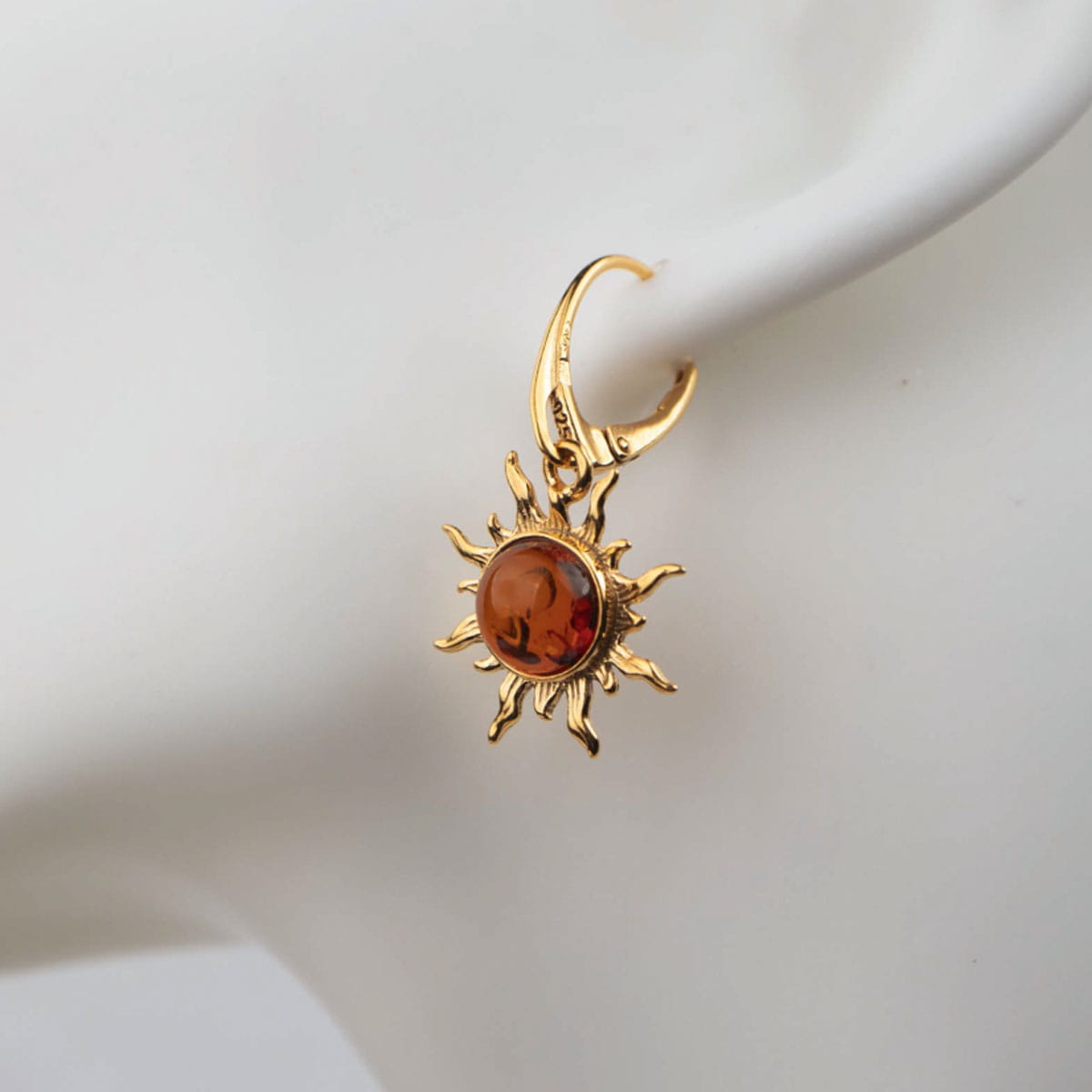 Gold plated silver 925 earrings in the shape of a sun with a round amber piece in the middle.