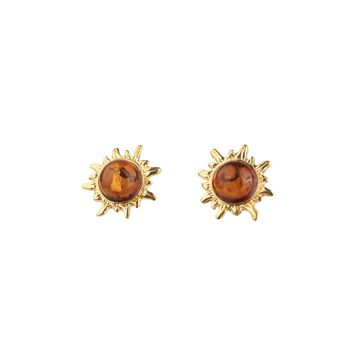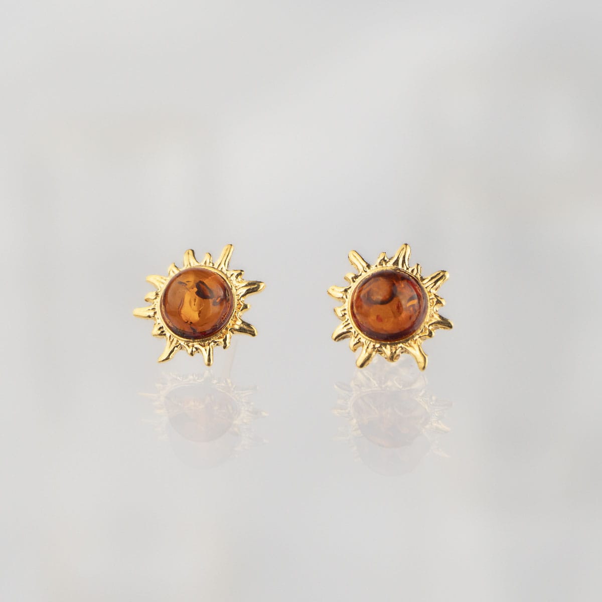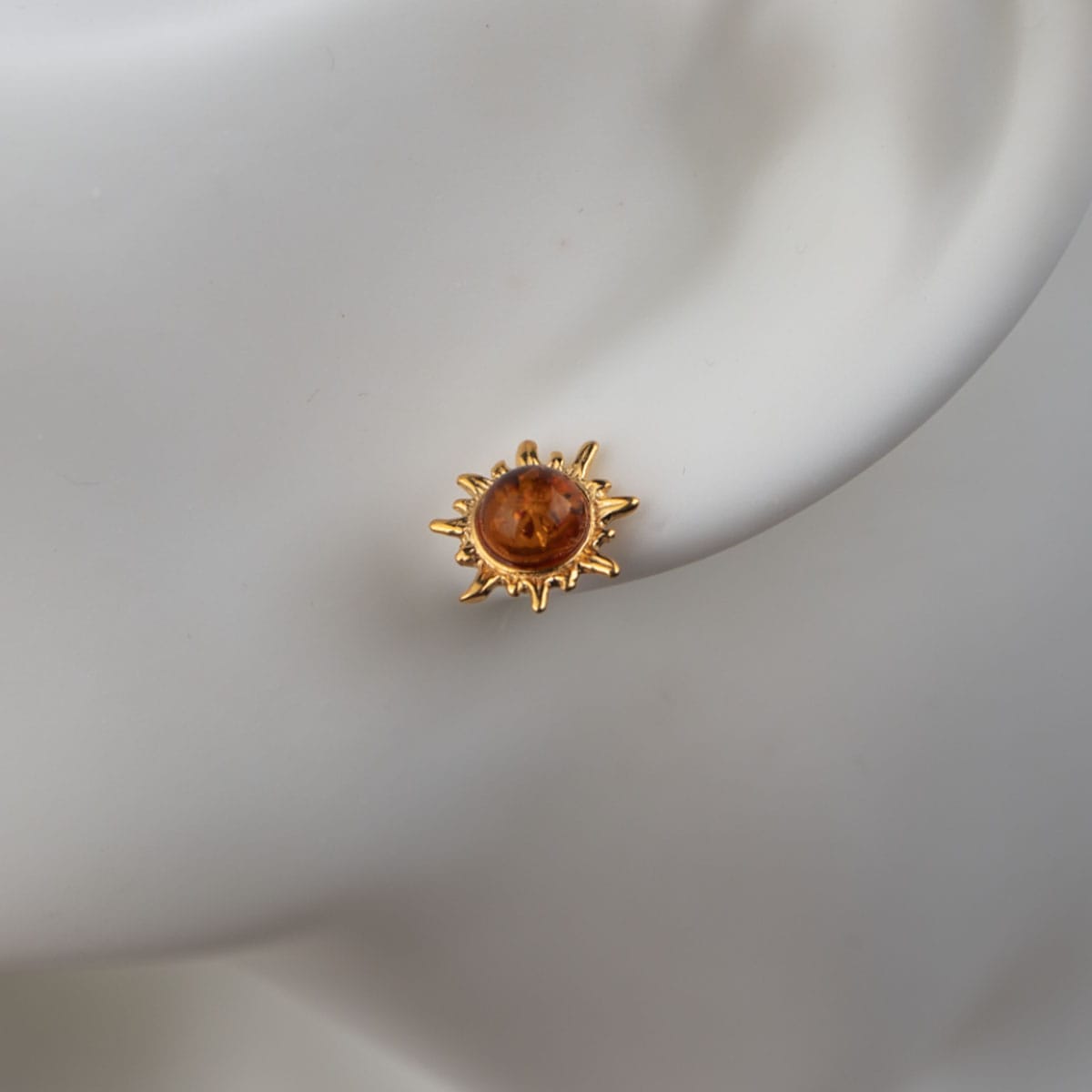 Gold plated silver 925 earrings in the shape of a sun with a round amber piece in the middle, studs.