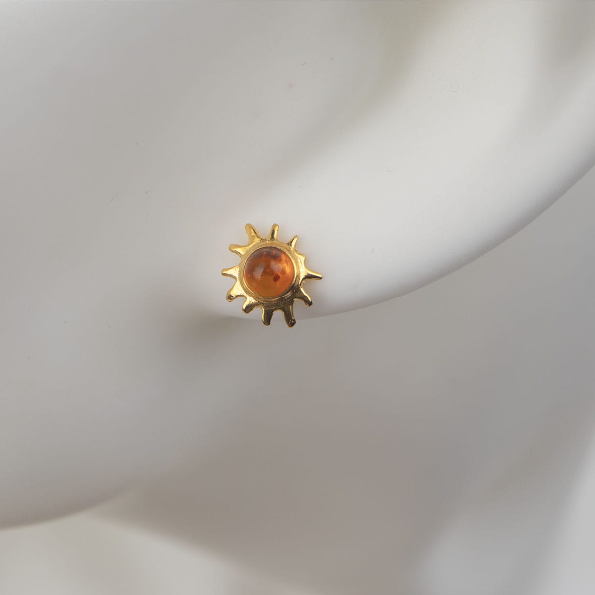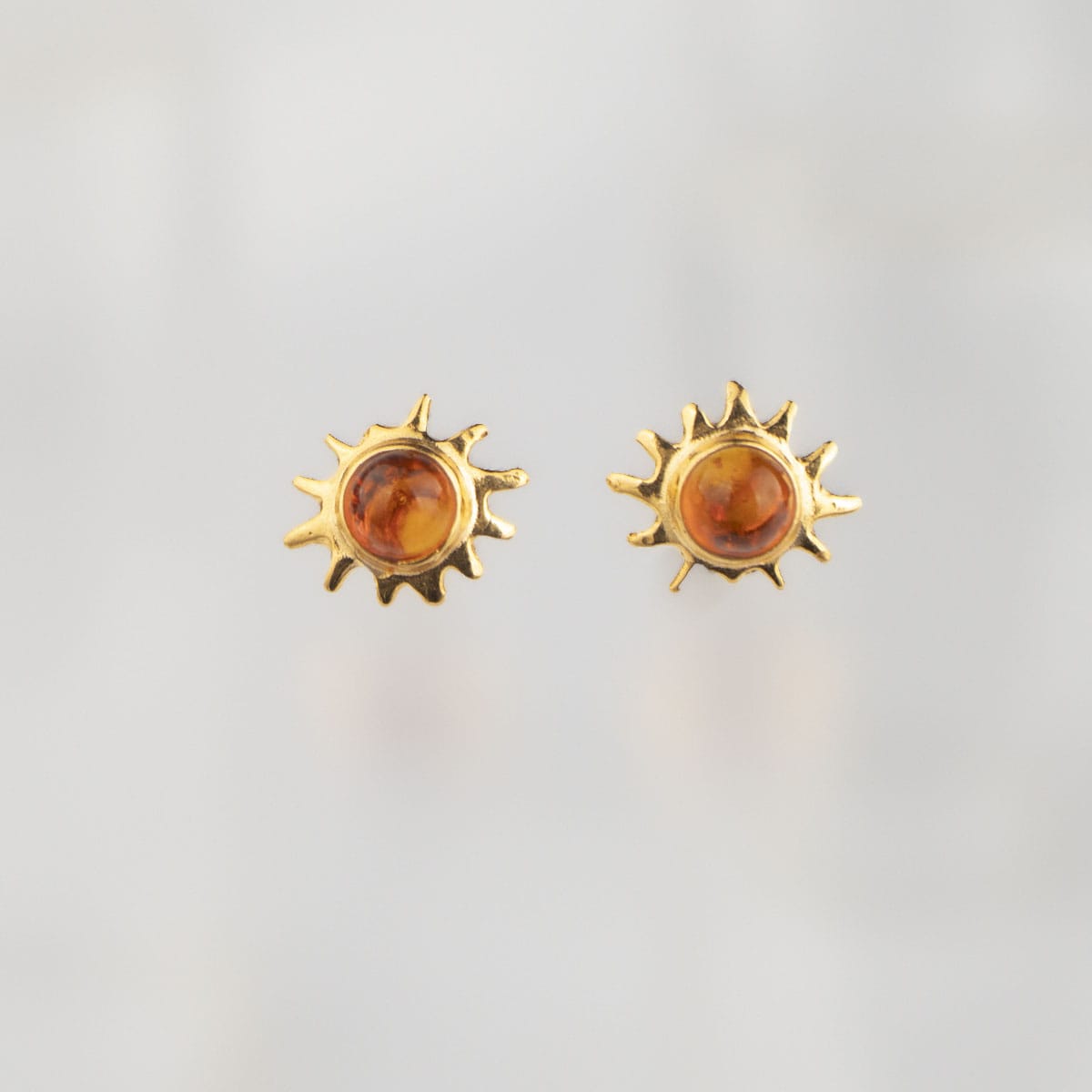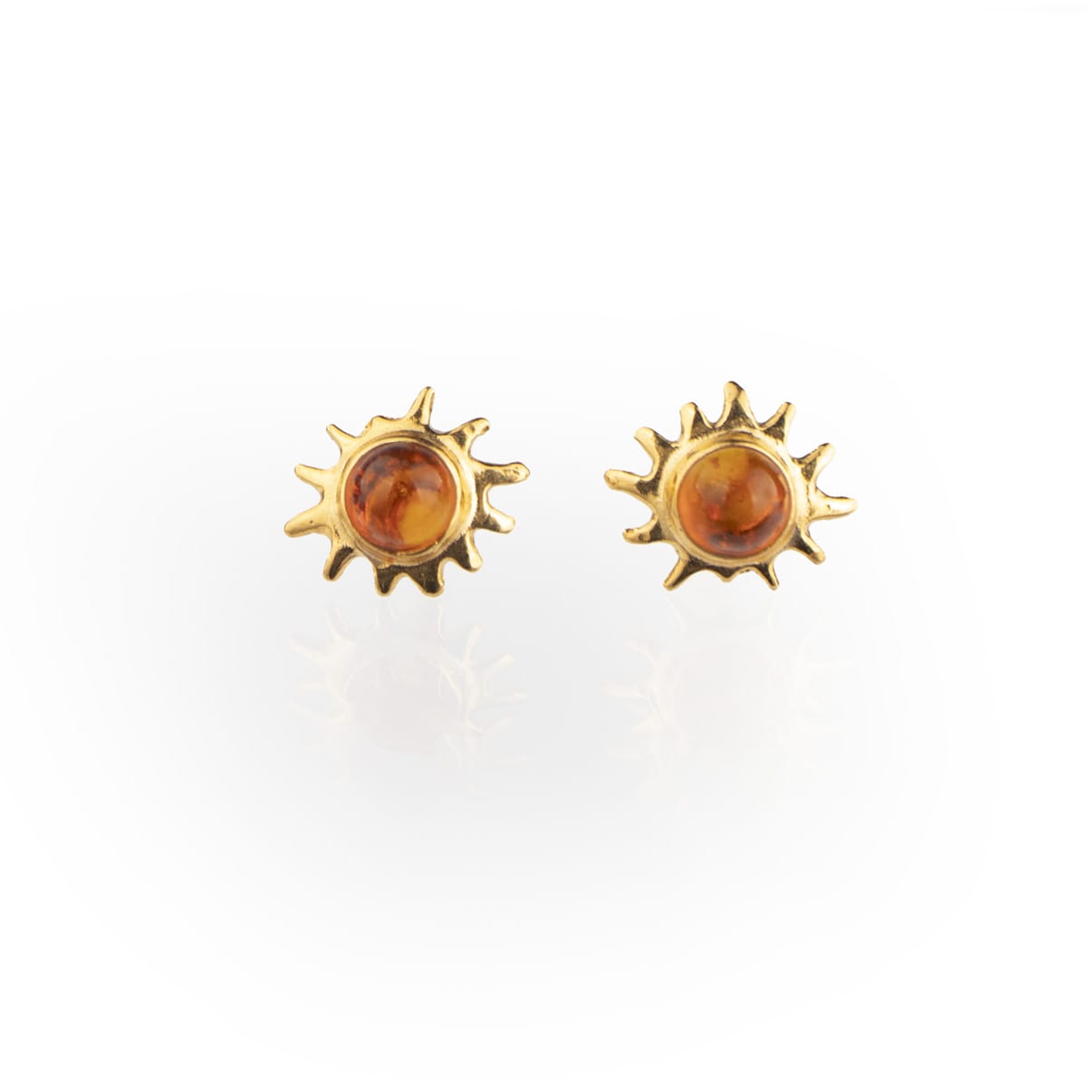 Gold plated silver 925 earrings in the shape of a sun with a round amber piece in the middle, studs.