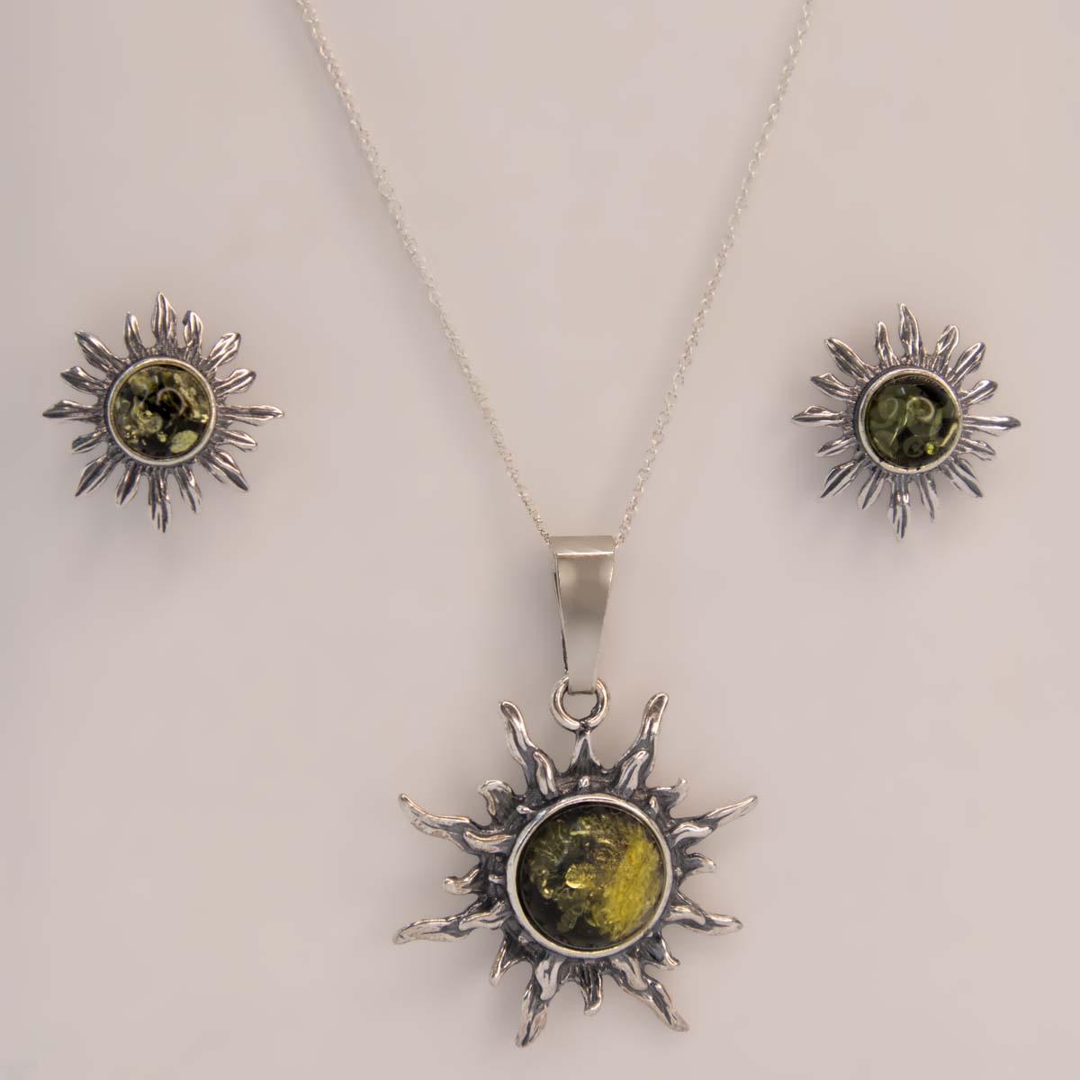 Silver jewelry set inspired by the sun motif – a powerful symbol in Latvian folklore. The set includes earrings and a pendant in the shape of the Baltic Sun, enhanced with olive greenish amber. The sun shape symbolizes light, renewal, and the cycle of life – a unique cultural symbol deeply rooted in Latvian tradition.